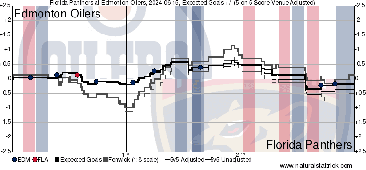 Corsi King – It wasn’t like Edmonton spent a crazy amount of time on the attack, but they were extremely opportunistic all night long. That’s a nice way of saying the Panthers goaltending was terrible. Phillip Broberg (54.83 percent) went from a healthy scratch for three rounds to now being a focal point in the top four. He had a great game today after he and Nurse (45.55 percent) made some blunders the game prior. Up front, Derek Ryan (63.59 percent) had the highest percentage but only played 6:54 during 5v5 play. Mattias Janmark (54.71 percent) had people on the internet calling this the Janmark game early – he was tenacious and all over the puck 5v5 while being the catalyst to everything with the shorthanded goal. He and Connor Brown (45.69 percent) have formed one of the best-shorthanded duos this postseason and have come in clutch with a few postseason tallies.