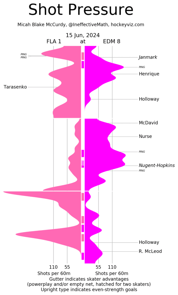 xGF% – I’m not about to harp on Mattias Ekholm (39.40 percent) who has been so essential. Without him the Oilers probably don’t make it out of the Pacific division finals, he’s been the real secret anchor to everything they’ve done this postseason. I was interested to see Nugent-Hopkins (50.67%) finish with under ten minutes of 5v5 play, but his presence on both the powerplay and the penalty kill contribute to that. I was also looking for more of a reason to mention both Zach Hyman (61.60 percent) and Leon Draisaitl (54.68 percent) and they gave one today. Draisaitl is probably a little banged up – who isn’t this time of year – but he got some scoresheet action which could be a motivator going back to Florida. Neither of them were the star that Dylan Holloway (54.06%) who scored some very beautiful goals not a lot of guys would have the hands to score. After Evander Kane went out the Oilers needed someone to step up in their secondary scoring ranks – it was Janmark and Holloway.
