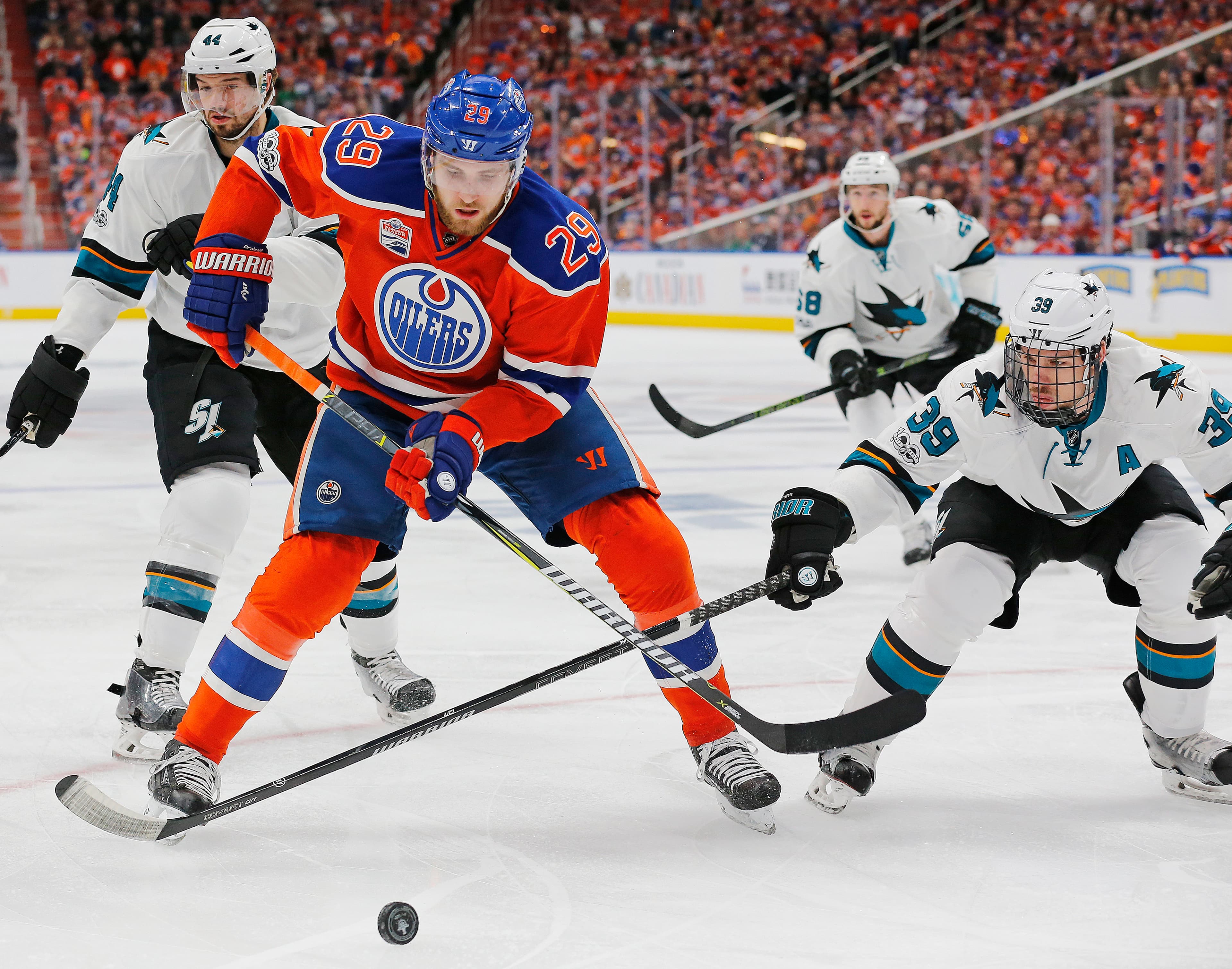 Apr 14, 2017; Edmonton, Alberta, CAN; Edmonton Oilers forward Leon Draisaitl (29) and San Jose Sharks forward Logan Couture (39) chase a loss puck during the first period in game two of the first round of the 2017 Stanley Cup Playoffs at Rogers Place. Mandatory Credit: Perry Nelson-USA TODAY Sports