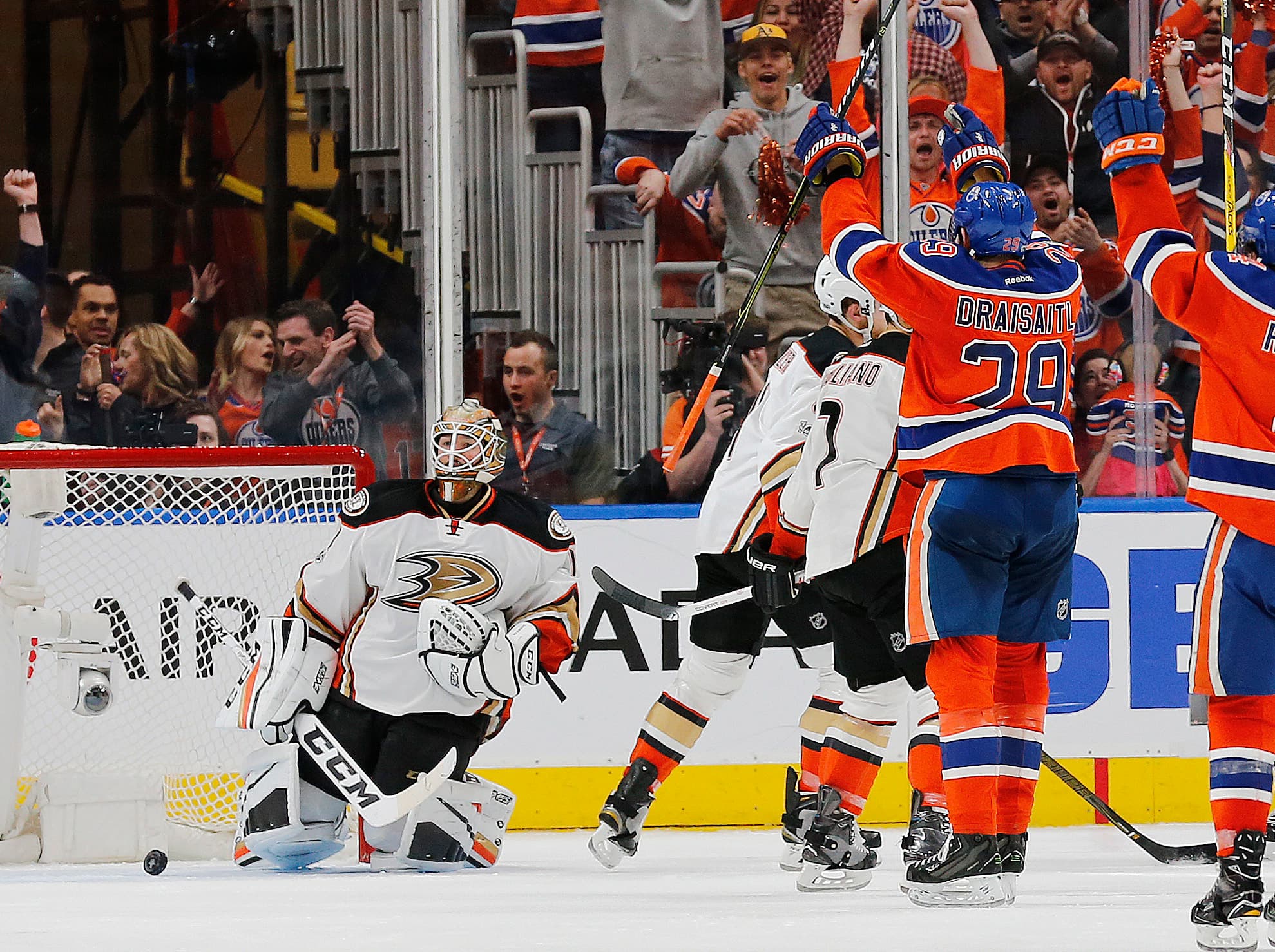 May 7, 2017; Edmonton, Alberta, CAN; Edmonton Oilers forward Leon Draisaitl (29) celebrates his second period hat-trick goal against the Anaheim Ducks in game six of the second round of the 2017 Stanley Cup Playoffs at Rogers Place. Mandatory Credit: Perry Nelson-USA TODAY Sports