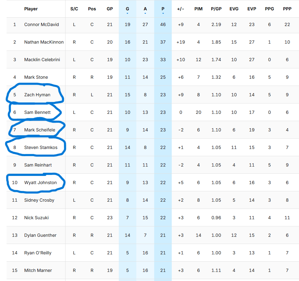 Hyman is fifth in points with 23 and he is third in goals with 15. The top four scorers — Connor McDavid, Nathan MacKinnon, Macklin Celebrini and Mark Stone — are already on the team. Hyman, Sam Bennett, Mark Schiefele, Steven Stamkos, Wyatt Johnston, Travis Konecny and Seth Jarvis are options to replace Point. Despite having a good run from December 1st, I don’t think Stamkos is a legitimate option due to his age and speed.