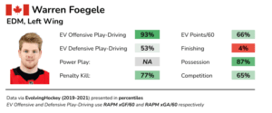 At the same time, there is a chance that Foegele could complement Draisaitl and RNH on the 2nd line than Yamamoto. Foegele’s value also comes from his aggressive forechecking, and in fact, per Corey Szjadner, Foegele’s forechecking microstats have also been superior to Yamamoto’s.
