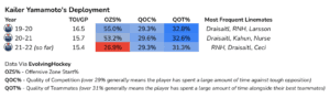 All things considered, I think it’s fair to say bad fortune is not the primary reason behind Yamamoto’s struggles. Even if he was quite fortunate, from both an eye test and scoring chance-wise perspective, he was by far at his best in 19-20. He earned those bounces that season, as opposed to his other campaigns. I don’t feel bad luck is the cause of his recent play, but what about his deployment?