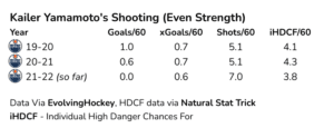 Fast-forward to 2021, and his point totals did indeed drop considerably. However, it was a more substantial decline than most expected. Yamamoto produced a 3.16 5v5 P/60. In 20-21, it dropped to 1.28. His production rate in 19-20 was nearly 2.5x higher. So, was his play the following year simply a mirror of 19-20? Was he unlucky this time?