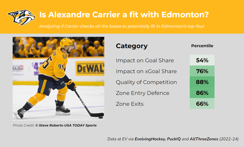 Alexandre Carrier, a 27-year-old defenceman with the Nashville Predators, is a player Edmonton’s management should take a long look at.