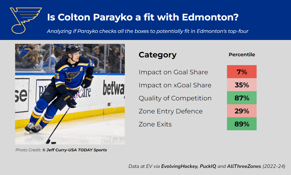 Parayko’s puck-moving could be a massive asset to Edmonton’s blueline, and perhaps his on-ice results improve in a relatively less difficult role with the Oilers, but considering his age and contract, he remains a risky option.