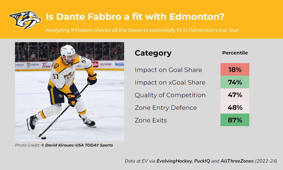Fabbro is one of the top puck-movers available, ranking in the 87th percentile in possession exits per hour, while he remains fairly solid at limiting turnovers. Fabbro’s goal differential impact ranks poorly, but this is primarily affected by the fact that Nashville has scored 58 goals on 78 expected goals with Fabbro on-ice, suggesting that Fabbro’s on-ice goals rate would significantly improve on a team with superior forwards (such as Edmonton).