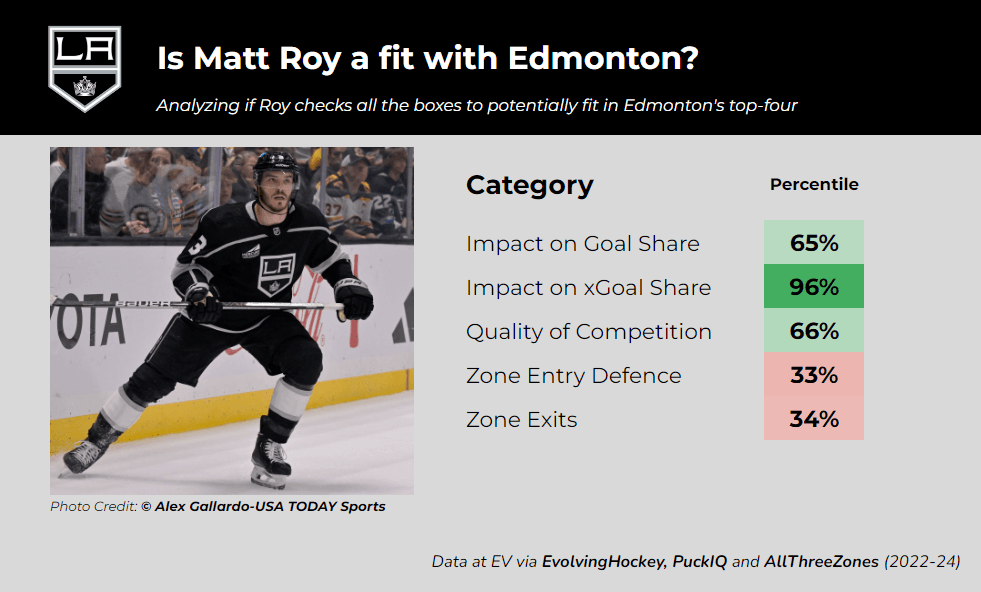 - Matt Roy’s on-ice xG results have been excellent. However, considering his subpar entry defence/zone exit results, he may not be a great stylistic fit with Nurse, and there is no guarantee a rival team like LA would move Roy to Edmonton. But, if the Kings continue to slide and fall out of the playoff picture, could they be open to selling an expiring contract such as Roy for assets? Perhaps he could still be a solid option considering his on-ice impacts.