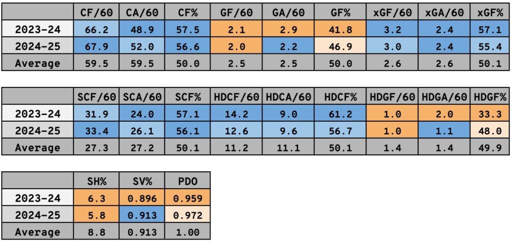 Edmonton’s record in 2024-25 is improved from where they were last year, picking up two more wins, and four more points. The Oilers sit much closer to the league average rate this year than last, albeit still below the league average mark. They’ve managed to find a way to secure a couple more wins, likely thanks to improved five-on-five goaltending, but while the team is generating more shot attempts and scoring chances, there has been a dip in the quality of those chances.