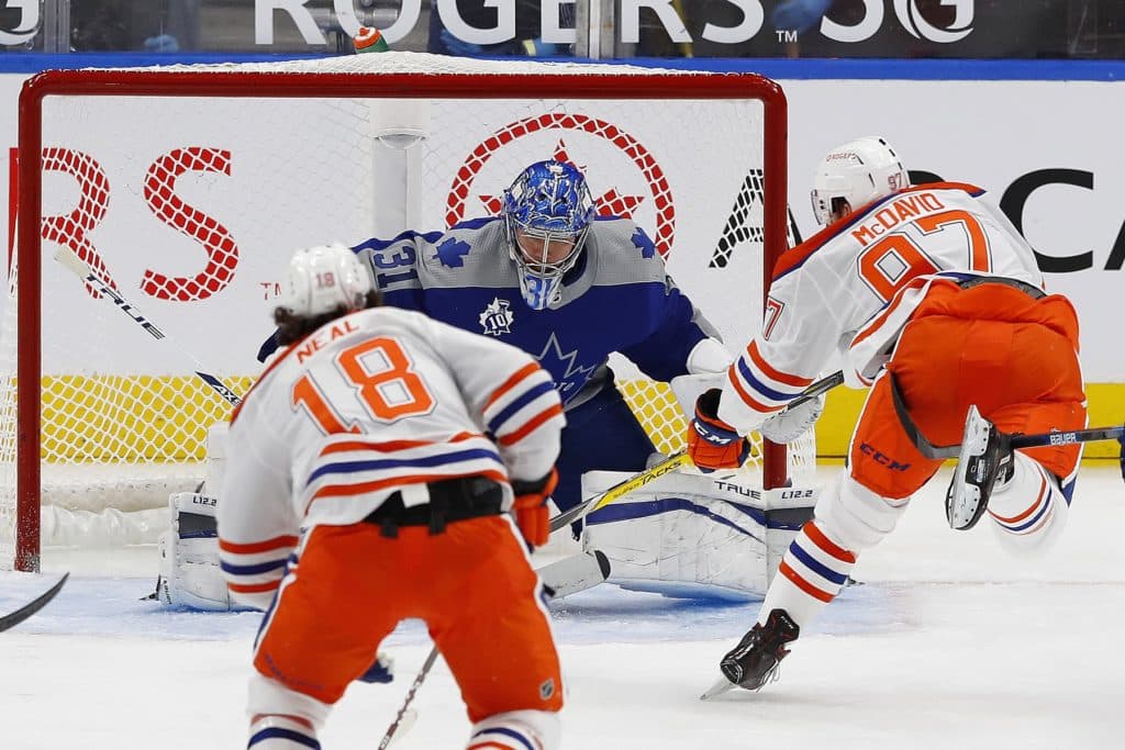 Jan 30, 2021; Edmonton, Alberta, CAN; Edmonton Oilers forward Connor McDavid (97) scores a second period goal against Toronto Maple Leafs goaltender Frederik Andersen (31) at Rogers Place. Mandatory Credit: Perry Nelson-USA TODAY Sports