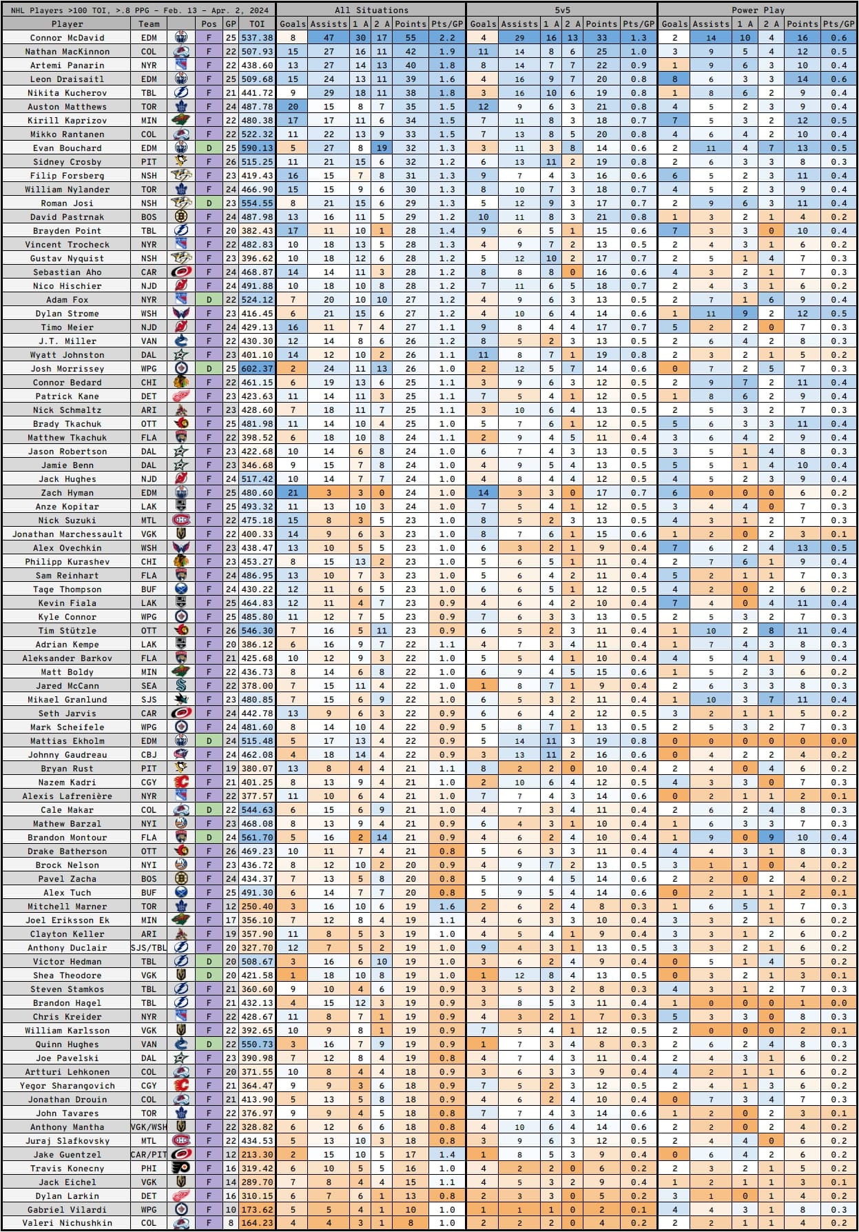 Looking at all players who played over 100 minutes since Feb. 13, few are scoring near as much as McDavid is. Nathan MacKinnon is second in points over that time, with 42 in 22 games played, for a 1.9 point per game rate. Artemi Panain is third with 40 points in 22 games, for a 1.8-point per game rate. Leon Draisaitl is fourth with 39 points in 25 games, scoring 1.6 points per game. Nikita Kucherov has 38 points in 21 games, for a 1.8-point per game rate. Those five players are the only ones who have over 38 points in that stretch, with Auston Matthews fifth with 35 points.