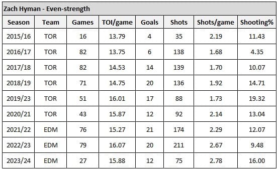 Suppose Hyman stays healthy and plays in 95 percent of the games this upcoming season (which is the proportion of games he’s played in since joining the Oilers) – so about 52 games – and takes 2.53 shots per game, which is what he’s averaged over the last few seasons. He should get about 132 shots on goal at even strength in that case. And if he posts the same shooting percentage that he’s had over his career in Edmonton (11.52 percent), he should score about 15 even-strength goals over the last 55 games of the 2023/24 season.