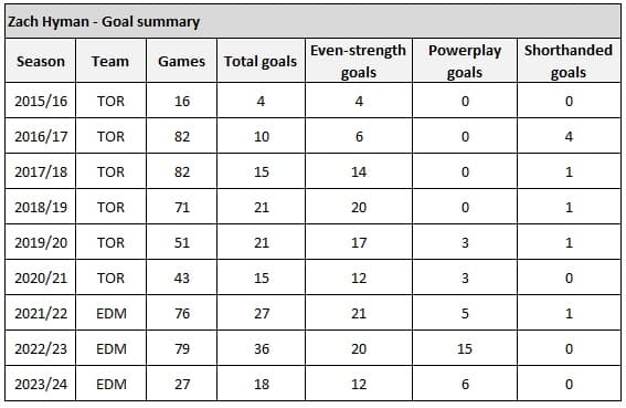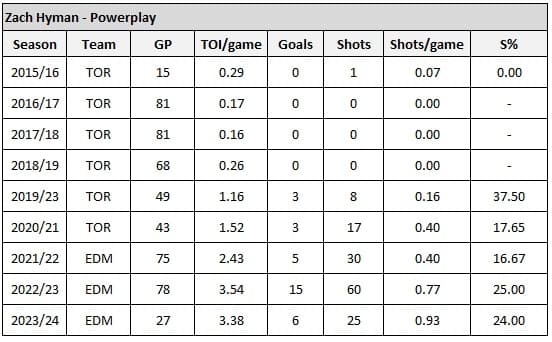 And on the powerplay, I think we can reasonably expect around eight more goals from Hyman throughout this season. The table below is a summary of his powerplay history.