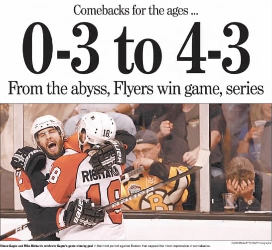 The Philadelphia Flyers are the third team to launch a comeback from a 3-0 deficit. They fell in games one and two in Boston by a score of 5-4 and 3-2, before the Bruins got the series stranglehold 4-1 in game three.