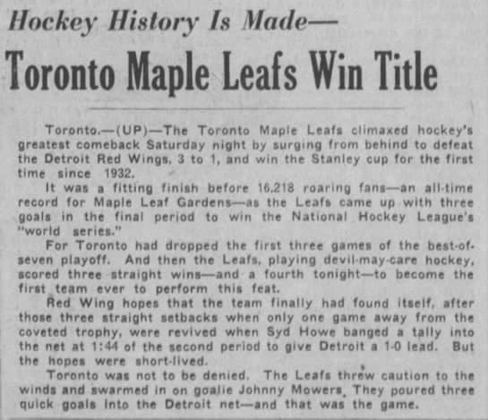 The Leafs stole game five in dominating fashion winning 9-3, before Turk Broda recorded a shutout for the team in game six. With the cup on the line, the Leafs were down 1-0 heading into the third frame. That’s before Sweeney Schrlner scored twice and Pete Langelle added one of his own for the Leafs to win.