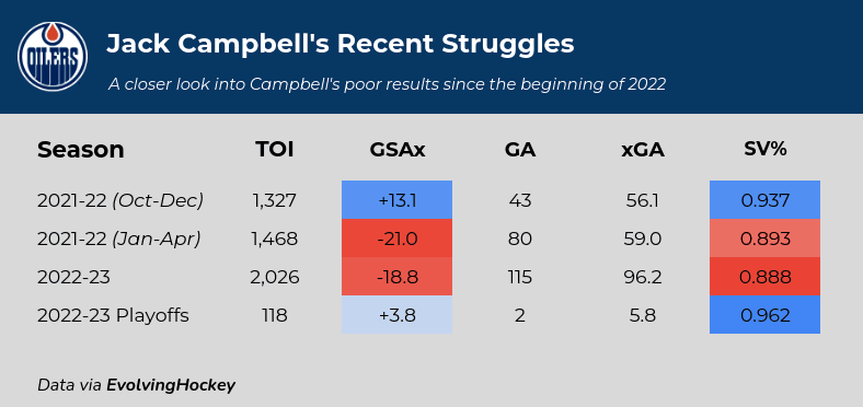 Arguably the biggest question mark heading in 2023-24 is Jack Campbell. Here’s a closer look at Campbell’s results throughout his last few seasons: