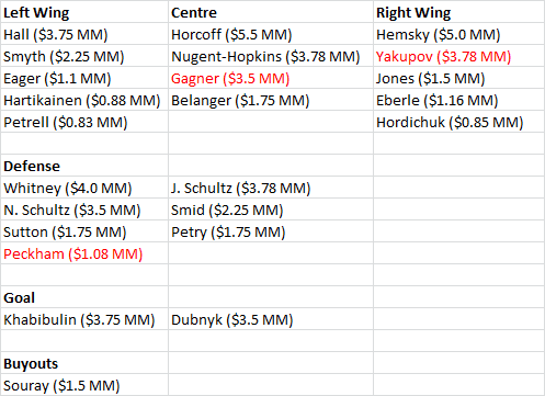 I’ve made a few assumptions here. I’ve assumed that Nail Yakupov will sign for the rookie maximum, and that Theo Peckham (if he returns) will be on a deal identical to his qualifying offer. I’ve also penciled in Gagner on a longish-term, $3.5 million/season deal. That’s based largely on this group of comparables; it seems reasonable to me that if the Oilers keep him he’s in that ballpark.