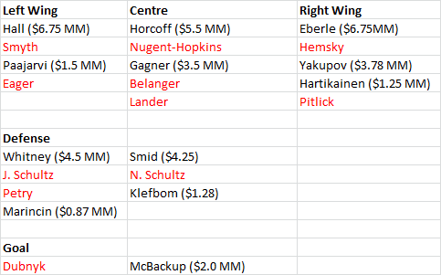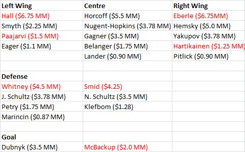 On the back-end, contracts to Dubnyk, Petry and the Schultzes will have expired at this point. That frees up a little over $12.5 million, but it also means the team is looking for a new starting goaltender and possibly two top-four defensemen. This is the year that the development of Klefbom and Marincin (and the rest of the young defenders) may start paying off if they’re capable of handling top minutes.