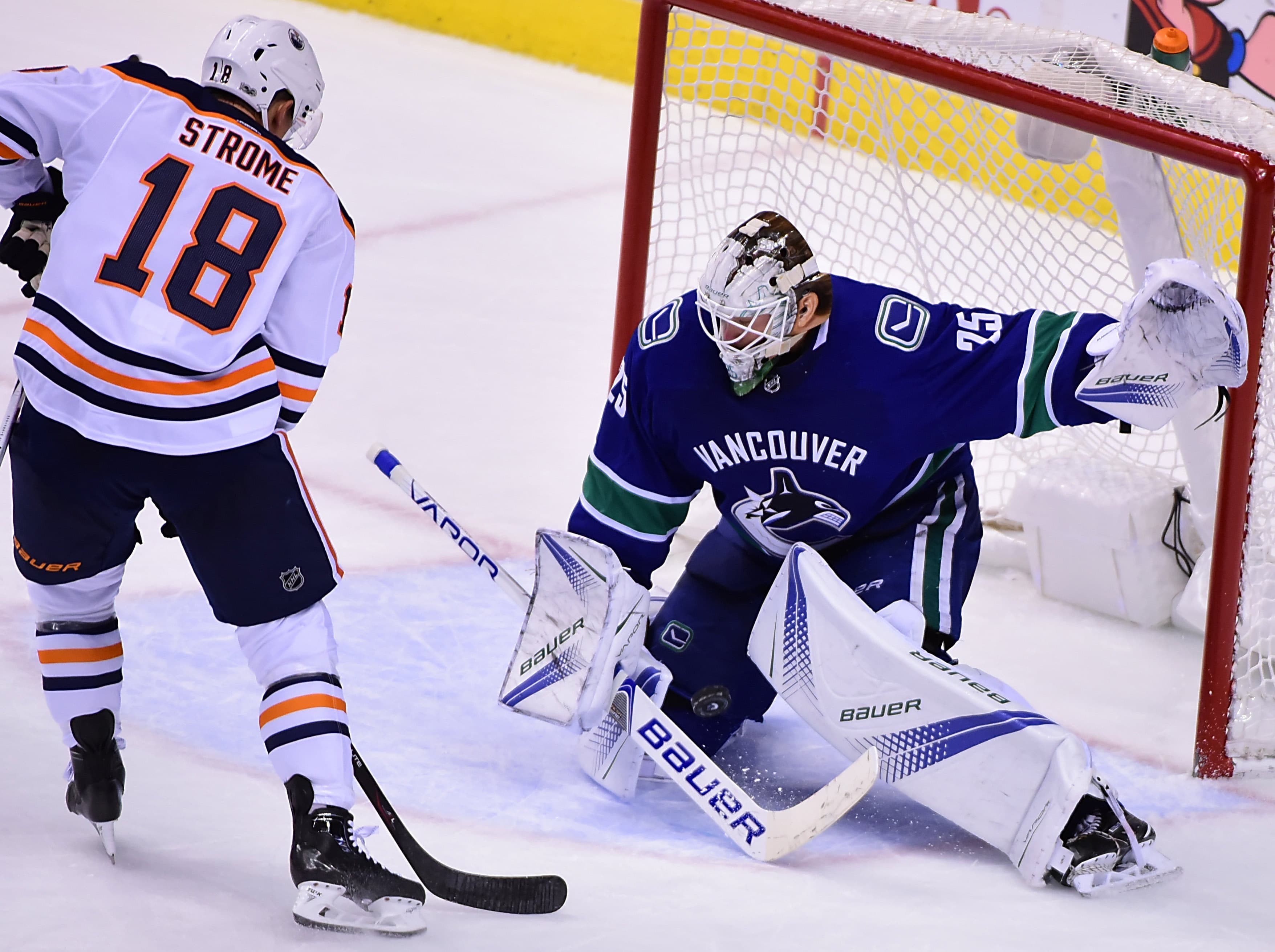 Sep 30, 2017; Vancouver, British Columbia, CAN; Vancouver Canucks goaltender Jacob Markstrom (25) blocks a shot on net by Edmonton Oilers forward Ryan Strome (18) during the third period at Rogers Arena. Mandatory Credit: Anne-Marie Sorvin-USA TODAY Sports