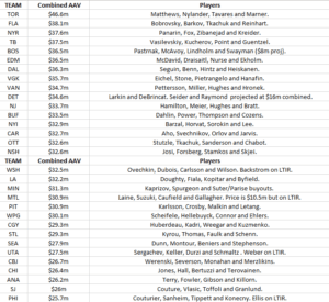 For this season their combined cap hits total $33.8m, which equates to 38.4% of the salary cap — a very reasonable number. Currently Ekholm has the fourth highest salary on the Oilers at $6m, which pushes their top four to $36.5m. Here is how all 32 teams rank with their four highest AAVs.