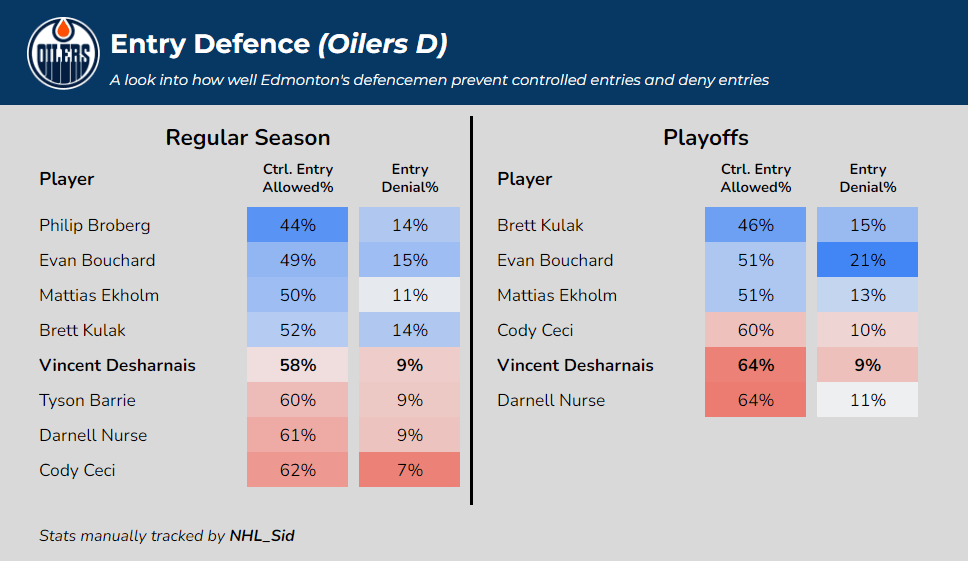 Puck retrievals in the DZ also seem to be a strength for Desharnais. Behind Ekholm and Bouchard, he ranked third on the Oilers defence core in retrieval success rate (60%) in the regular-season. In the playoffs, I modified my retrieval tracking, and specifically tracked how well a defender could retrieve pucks following an opposition dump-in.