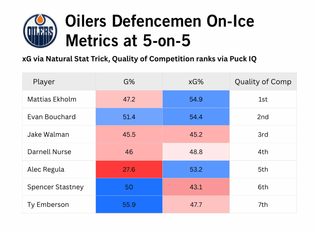 Bouchard and Ekholm are both hovering around a 54 percent share of the expected goals, which is among the best on the team. Although they had a rocky start to the season in terms of actual goals scored and conceded, that has since turned around. The top pair has been outscoring the opposition since the beginning of November.