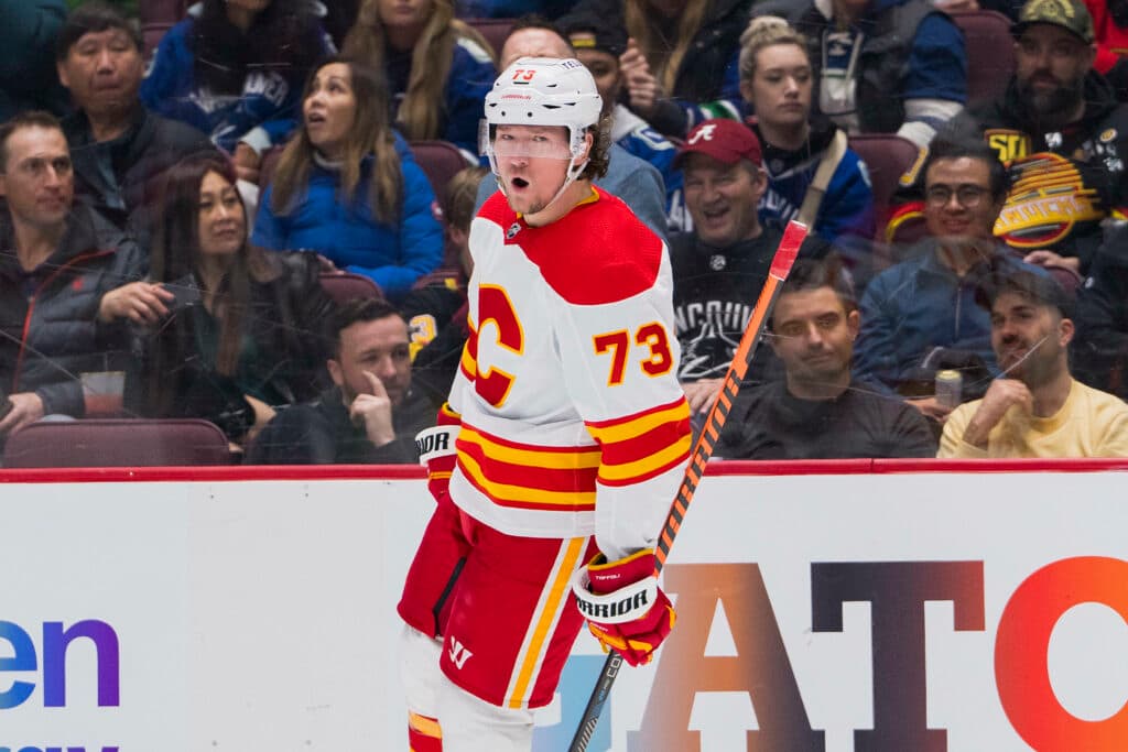 Mar 31, 2023; Vancouver, British Columbia, CAN; Calgary Flames forward Tyler Toffoli (73) celebrates his goal against the Vancouver Canucks in the second period at Rogers Arena.