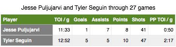 Looking back at Puljujarvi and Seguin’s first 27 games shows a fairly similar usage between the two players with one key difference: an extra minute and a half on the power play for Seguin. Despite Seguin’s limited time at even strength, Bruins head coach Claude Julien still made him a regular on the team’s power play, while Puljujarvi saw most of his time at 5-on-5. Neither rookie played much shorthanded so it’s interesting to see Julien found a role for Seguin on the Bruins’ power play while McLellan has been reluctant to utilize Puljujarvi with the man advantage.
