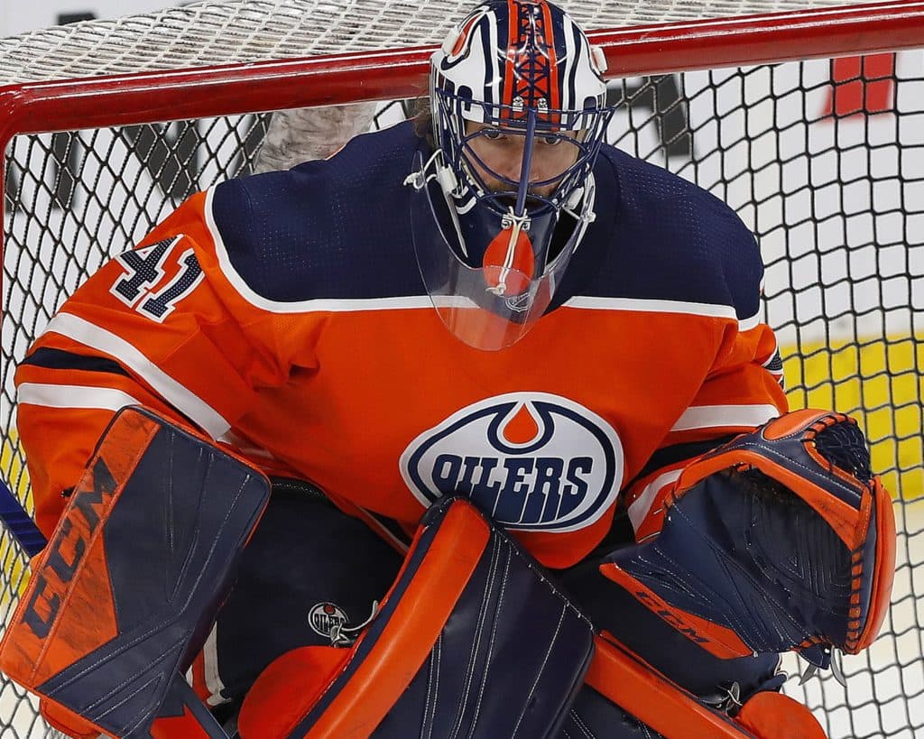 Feb 29, 2020; Edmonton, Alberta, CAN; Edmonton Oilers goaltender Mike Smith (41) makes a save during warmup against the Winnipeg Jets at Rogers Place. Mandatory Credit: Perry Nelson-USA TODAY Sports