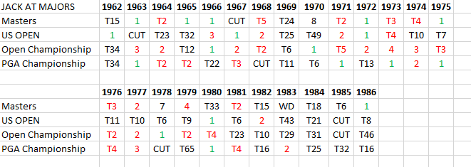 Here is Nicklaus’ record at Majors starting in 1962, the first year he won and his second year as a professional.