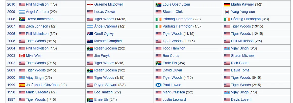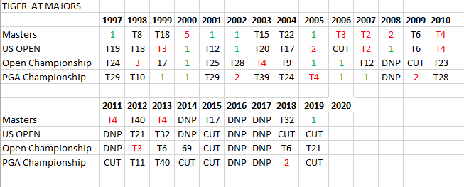 Here is Woods’ record at Majors starting in 1997 when he won his first.