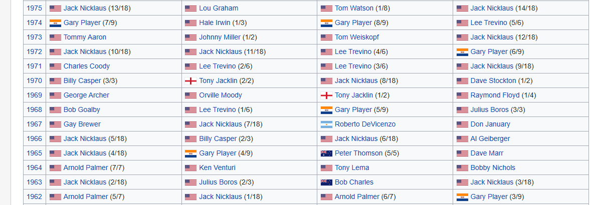 And these golfers each one once during this span, but also won prior to 1962 or after 1975: Tom Watson (won seven after 1975), Peter Thomson ( four prior to 1962), Raymond Floyd (three after 1975), Hale Irwin (two after), Dave Stockton (one after) and Johnny Miller (one after).