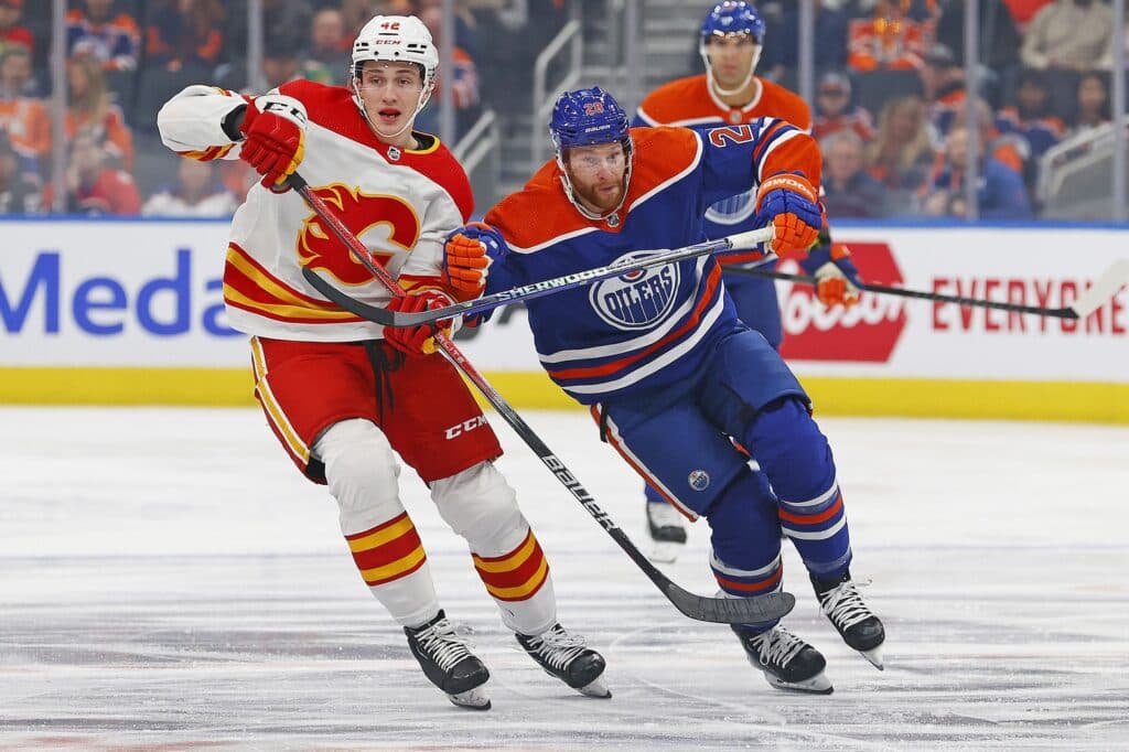 Oct 4, 2023; Edmonton, Alberta, CAN; Edmonton Oilers forward Connor Brown (28) and Calgary Flames forward Samual Honzek (42) chase a loose puck during the first periodat Rogers Place. Mandatory Credit: Perry Nelson-USA TODAY Sports