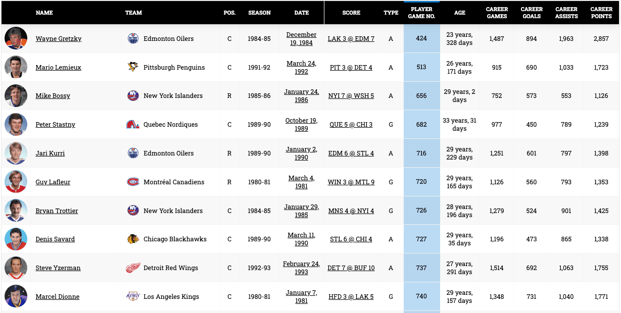 The two fastest to 1,000 NHL points were Wayne Gretzky and Mario Lemieux, who did so in 424 and 513 games respectively. The third-fastest, as it stands, is New York Islanders great Mike Bossy, who reached 1,000 points in his 656th game in the league. He just played his 602nd game in the NHL, so McDavid has 53 games left to beat Bossy.
