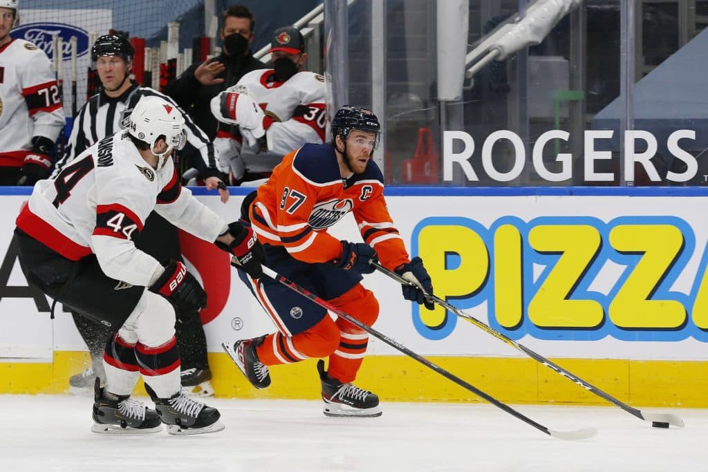 Mar 8, 2021; Edmonton, Alberta, CAN; Edmonton Oilers forward Connor McDavid (97) carries the puck around Ottawa Senators defensemen Erik Gudbranson (44) during the third period at Rogers Place. Mandatory Credit: Perry Nelson-USA TODAY Sports