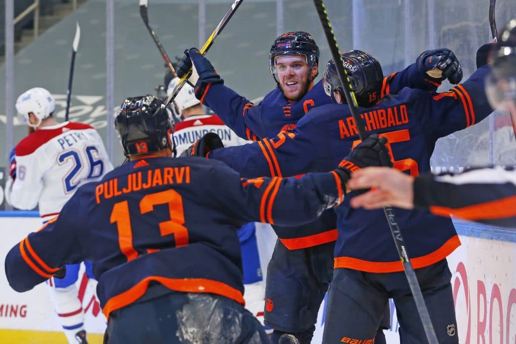 Apr 19, 2021; Edmonton, Alberta, CAN; Edmonton Oilers forward Connor McDavid (97) celebrates a third period goal against /the Montreal Canadiens at Rogers Place. Mandatory Credit: Perry Nelson-USA TODAY Sports