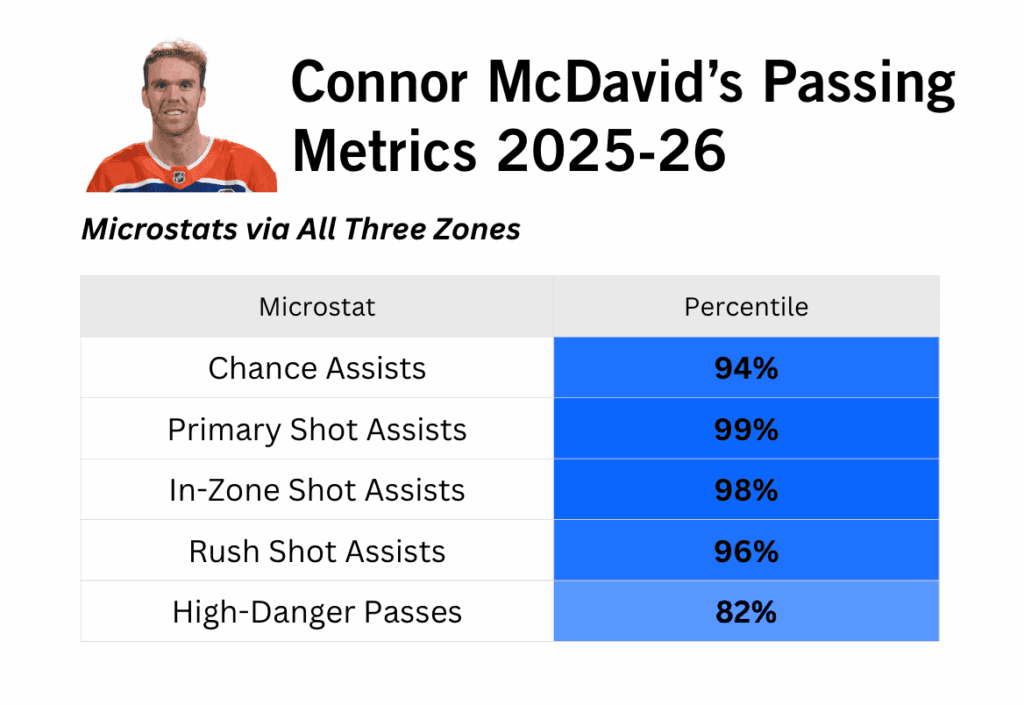 Those low shooting percentages certainly aren’t a reflection of McDavid’s playmaking either. Passing microstats from All Three Zones confirm that he still put his teammates in prime scoring positions all season long.