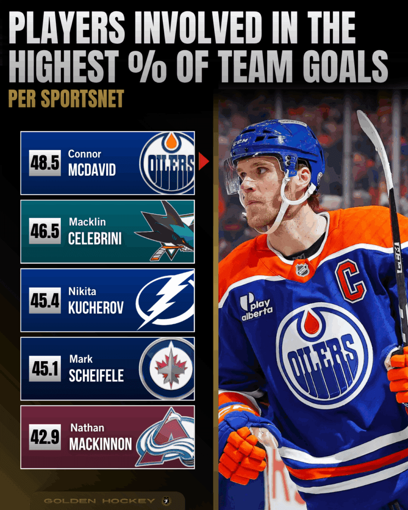 Nearly half of Edmonton’s goals have involved the captain. That’s an incredible accomplishment on the team that opened the season as one of the Stanley Cup favourites. The extent to which he carried the Oilers was even more pronounced when Leon Draisaitl went down with an injury late in the season.