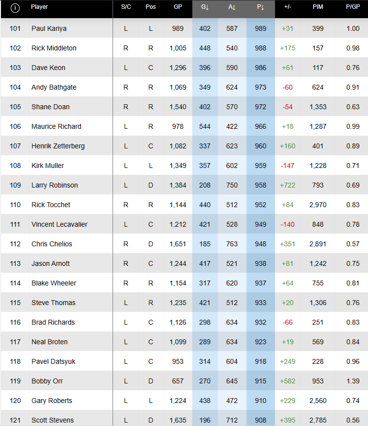 Elite players, in all sports, are playing longer and at a higher level than ever before. They are more educated on nutrition, training, stretching, recovery and rehabilitation. McDavid turns 27 in 10 days, and he will play at least 12 more seasons. That gives him 984 more games, not including the remainder of this season. McDavid has missed only 11 game due to injury over the past 7.5 seasons. Even if he misses 50 over the next 12 years, that still gives him 934 games to score between 1,000-1,020 points (assuming he scores 77 points in the final 47 games (1.63 PPG) this year.