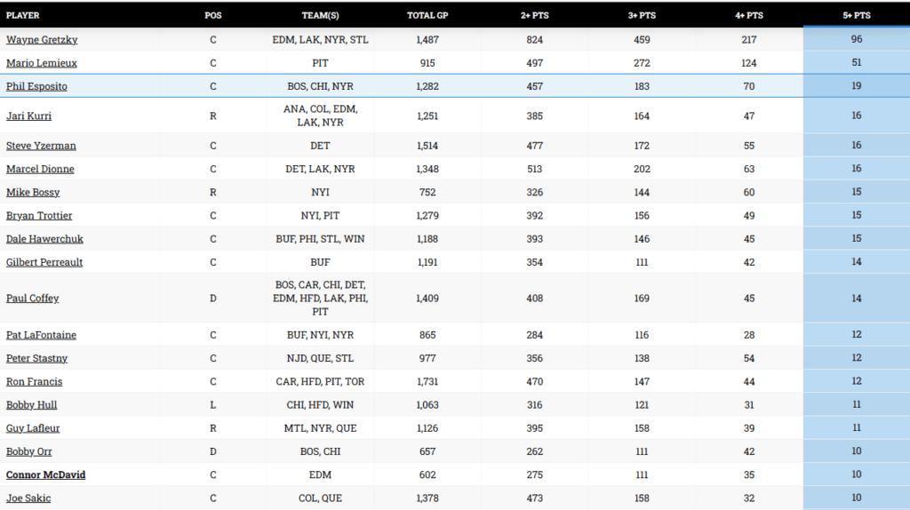 McDavid tied Bobby Orr and Joe Sakic for 17th-most five-point games last night with his 10th. He likely will challenge Phil Esposito for third all-time at 19.