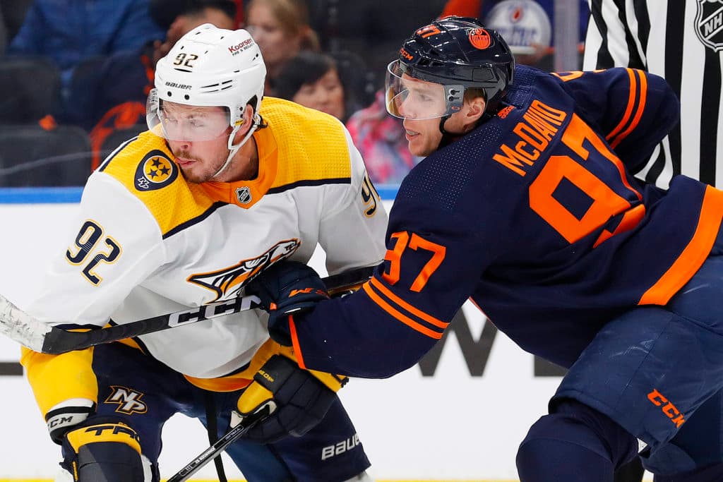 Nov 1, 2022; Edmonton, Alberta, CAN; Edmonton Oilers forward Connor McDavid (97) and Nashville Predators forward Ryan Johansen (92) battle for a loose puck during the second period at Rogers Place. Mandatory Credit: Perry Nelson-USA TODAY Sports
