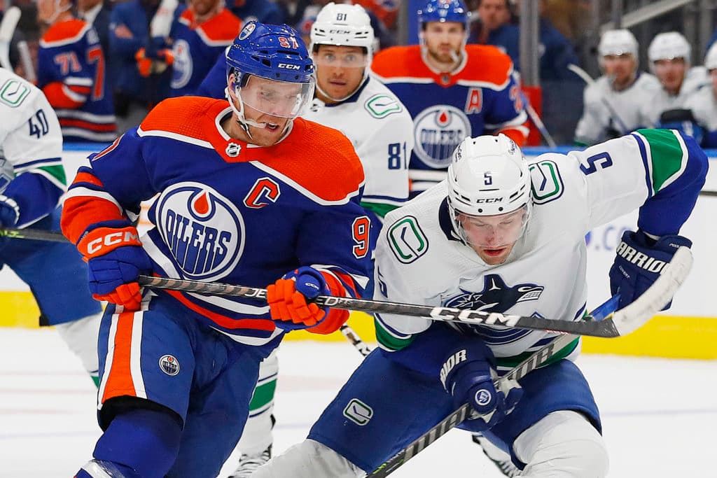 Oct 12, 2022; Edmonton, Alberta, CAN; Edmonton Oilers forward Connor McDavid (97) battles for a loose puck with Vancouver Canucks defensemen Tucker Poolman (5) during the third period at Rogers Place. Mandatory Credit: Perry Nelson-USA TODAY Sports