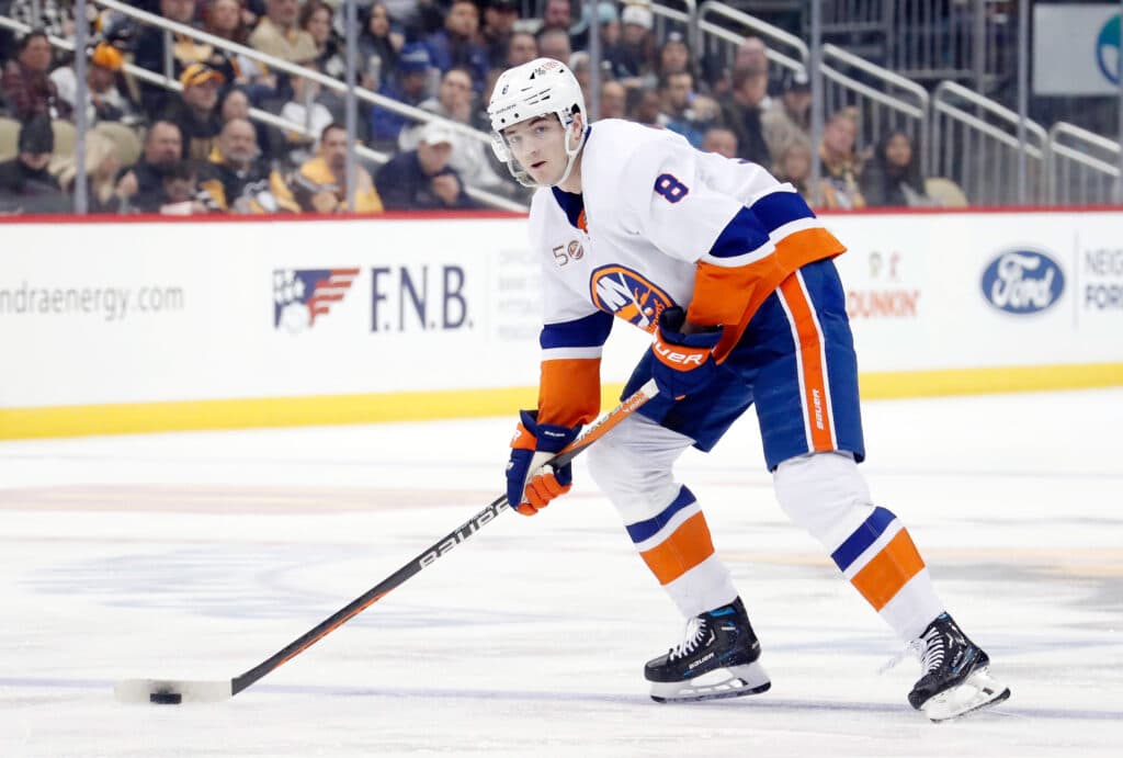 Mar 9, 2023; Pittsburgh, Pennsylvania, USA; New York Islanders defenseman Noah Dobson (8) handles the puck against the Pittsburgh Penguins during the second period at PPG Paints Arena. Mandatory Credit: Charles LeClaire-USA TODAY Sports