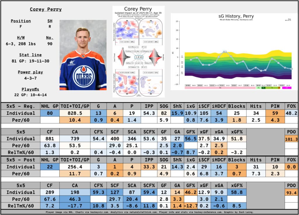 Perry’s five-on-five offence dipped during the playoffs, but five of the 10 goals he scored came on the power play — a mark that led all Oilers players. He remained a force all through the playoffs, including in the Stanley Cup Final where he scored three goals and four points.