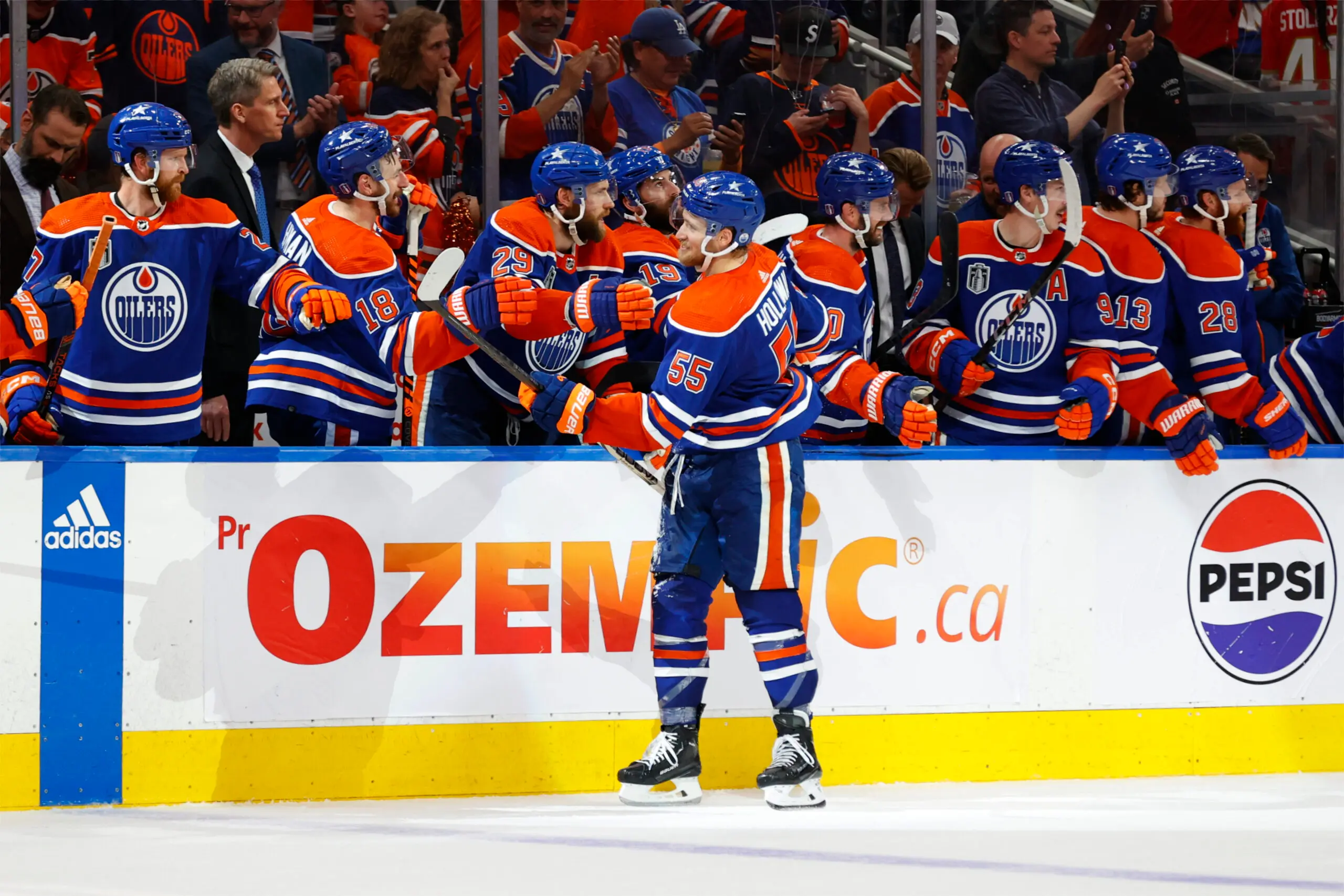 Jun 15, 2024; Edmonton, Alberta, CAN; Edmonton Oilers left wing Dylan Holloway (55) celebrates a goal with teammates in the third period against the Florida Panthers in game four of the 2024 Stanley Cup Final at Rogers Place. Mandatory Credit: Perry Nelson-USA TODAY Sports