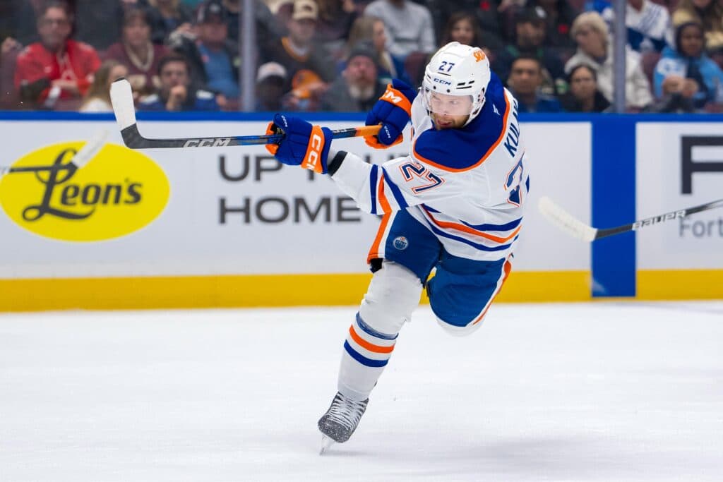 Nov 9, 2024; Vancouver, British Columbia, CAN; Edmonton Oilers defenseman Brett Kulak (27) shoots against the Vancouver Canucks during the first period at Rogers Arena. Mandatory Credit: Bob Frid-Imagn Images