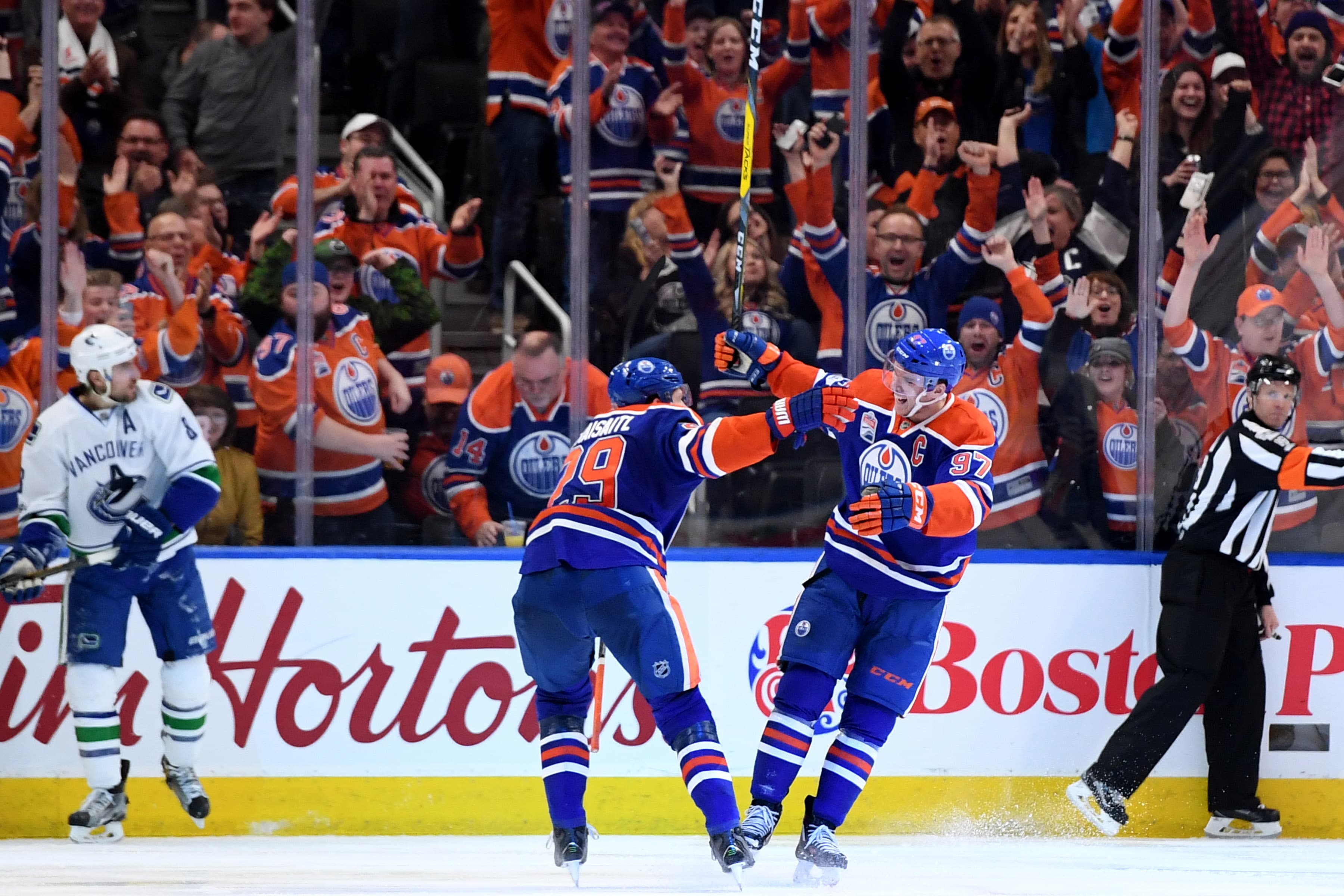Apr 9, 2017; Edmonton, Alberta, CAN; Edmonton Oilers center Leon Draisaitl (29) and Edmonton Oilers center Connor McDavid (97) celebrates Draisaitl’s third period goal against the Vancouver Canucks at Rogers Place. The goal marked McDavid’s 100th point of the season. The Oilers won 5-2. Mandatory Credit: Candice Ward-USA TODAY Sports