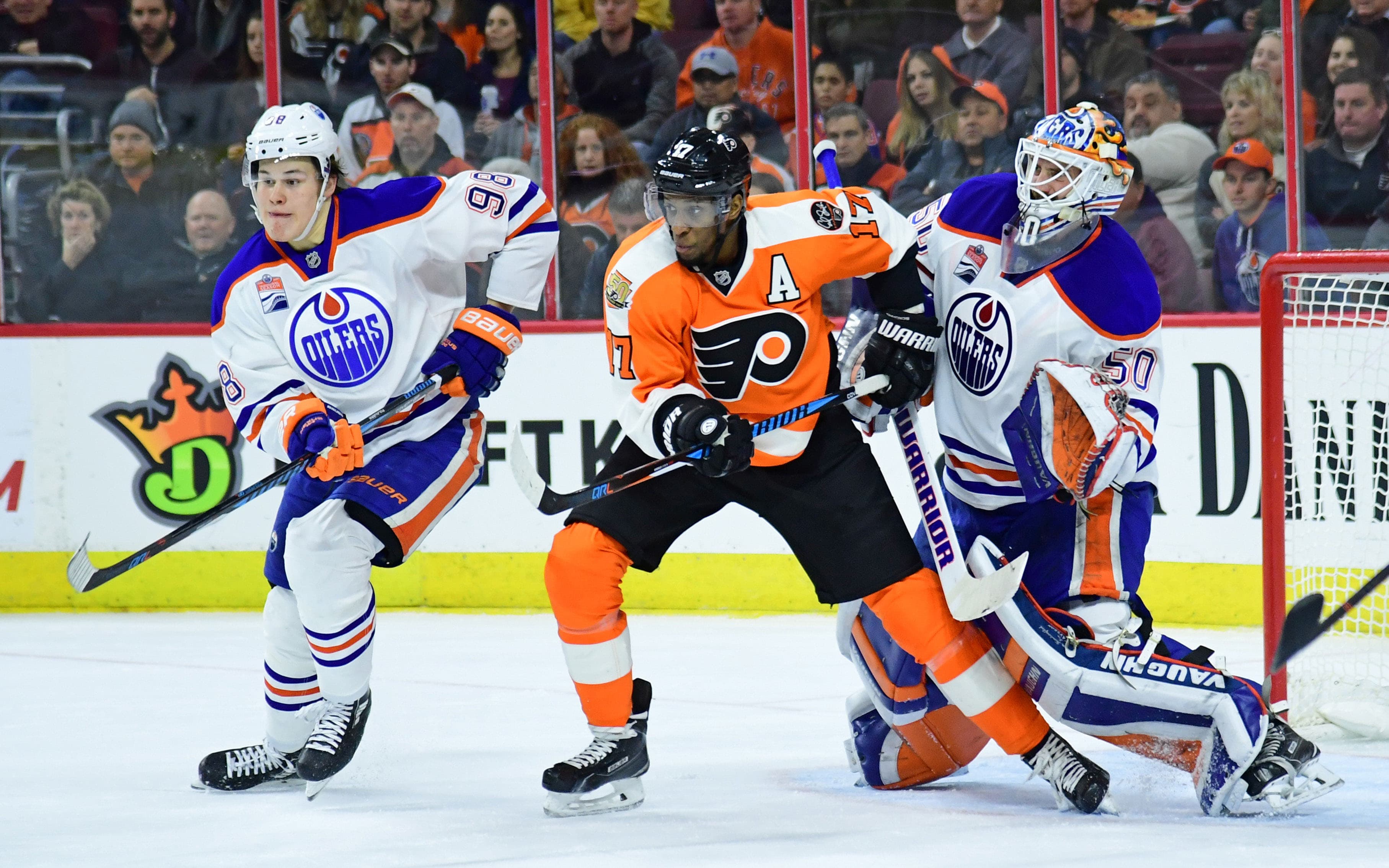 Dec 8, 2016; Philadelphia, PA, USA; Philadelphia Flyers right wing Wayne Simmonds (17) stands in between Edmonton Oilers right wing Jesse Puljujarvi (98) and goalie Jonas Gustavsson (50) during the second period at Wells Fargo Center. The Flyers defeated the Oilers, 6-5. Mandatory Credit: Eric Hartline-USA TODAY Sports