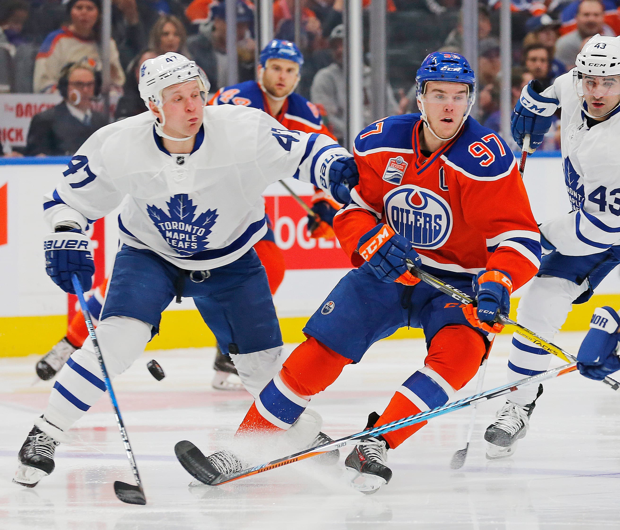 Nov 29, 2016; Edmonton, Alberta, CAN; Edmonton Oilers forward Connor McDavid (97) and Toronto Maple Leafs forward Leo Komarov (47) chase a loose puck during the third period at Rogers Place. Mandatory Credit: Perry Nelson-USA TODAY Sports