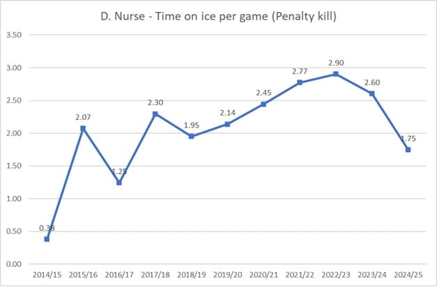 Another thing worth considering is the steady decline in Nurse’s minutes on the penalty kill. Nurse is averaging below two minutes a game this season, which is a significant drop off from the last four seasons when he was regularly on the top penalty-kill unit. The graph below shows his average ice time per season over the course of his career, and is a good indicator of the trust the coaching staff has in the player.